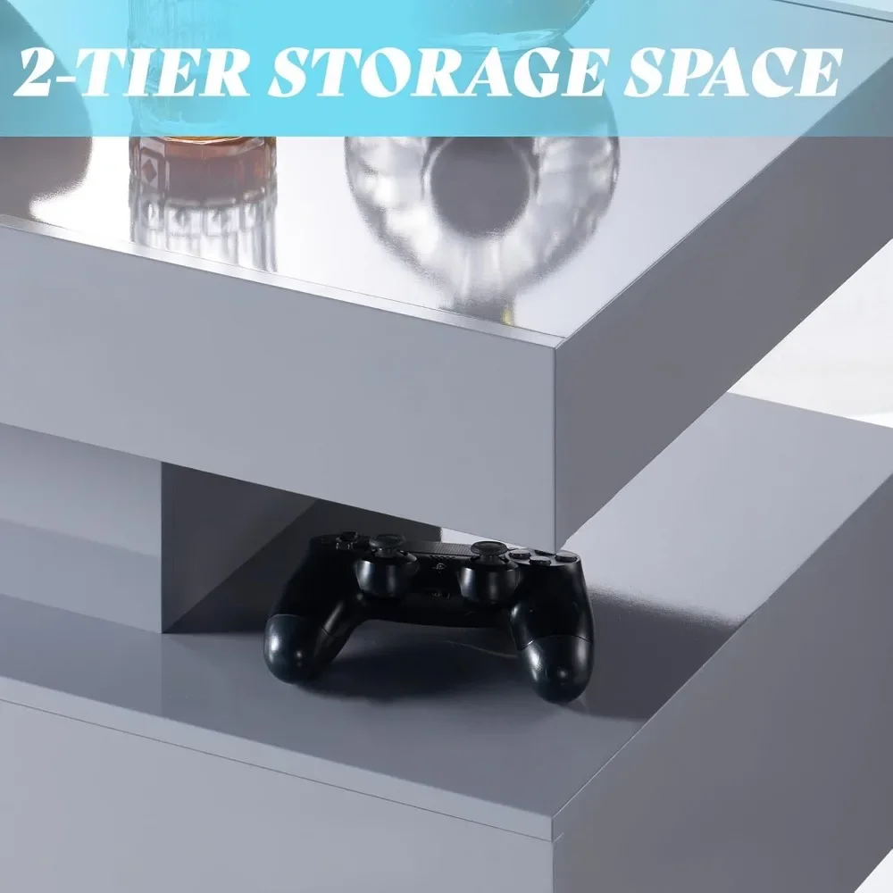Modern 40" High Gloss 2-Tier Coffee Table with LED Lights — Rectangular Minimalist Center Table with Open Storage