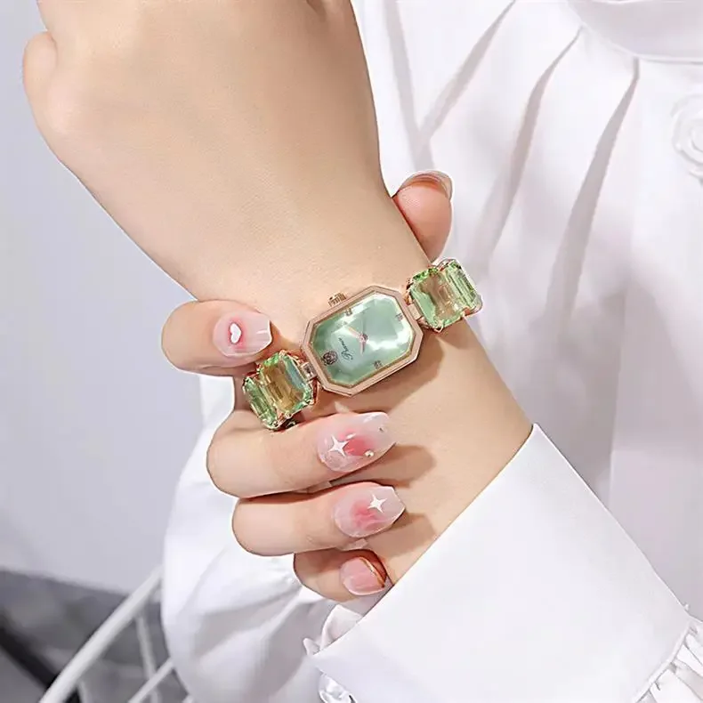 Trendy Girl's Wrist Watch – Stylish Rectangle Dial with Colorful Stones & Steel Band