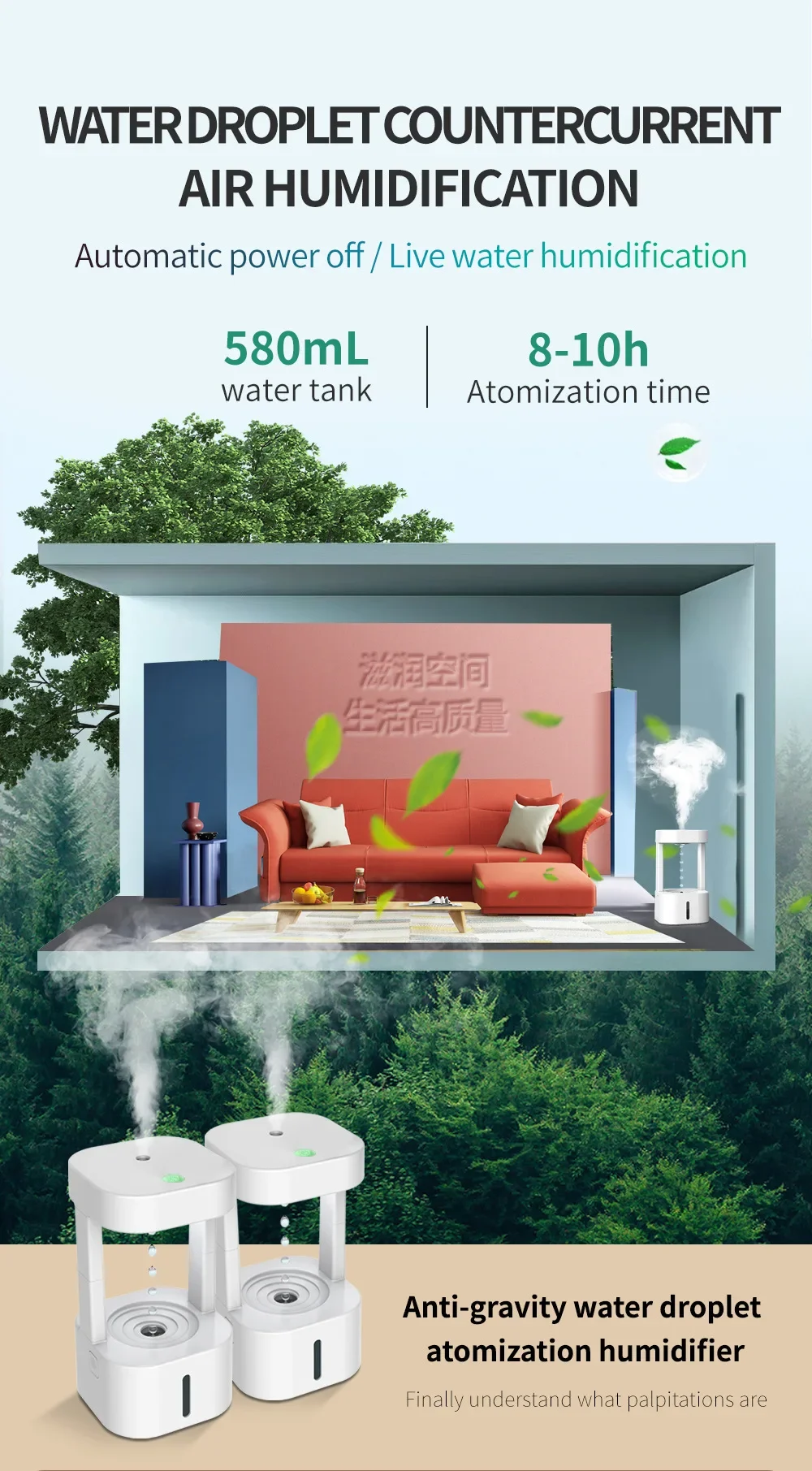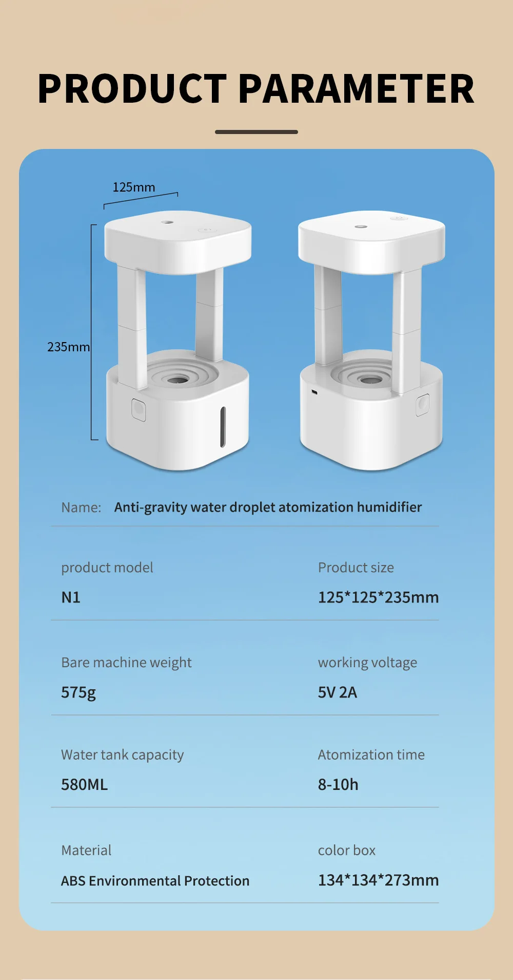 Ultrasonic Anti-Gravity Humidifier 580ML — Levitating Water Drop Design, Cool Mist Fogger with LED Night Light (3 Modes)